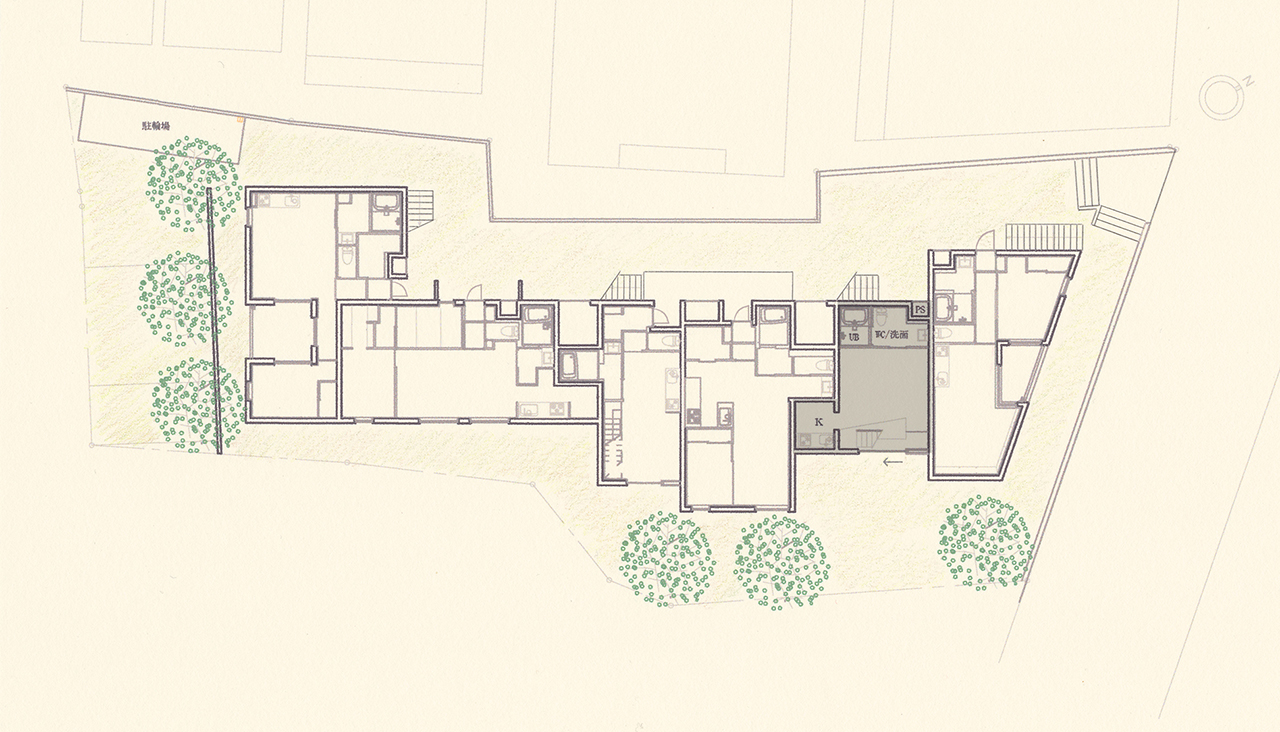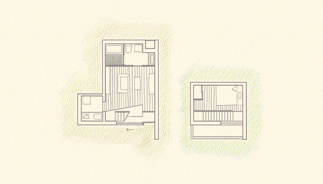 1LDK / 1階 / メゾネット 面積: 40.67㎡ 庭を抜けて玄関へ。 大きな開き戸を介して外と繋がる土間と腰掛けテーブルをつけて縁側のような空間にしました。友達が来たときには、部屋に上がる前にまずは縁側に座って話をしたり、お茶を飲んだり。。。 リビングから玄関越しに見える緑は大きな絵画のようです。 新芽が出てきたなぁ、葉っぱが色づいてきたなぁ、と季節の移り変わりを目や肌で感じることのできる外のような中のような場所。
